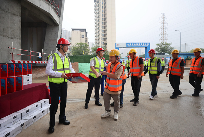 朱永繁董事長一行先后走進錦官花城綜合體、龍泉東洪片區(qū)開發(fā)項目現(xiàn)場,詳細了解工程概況、工期進度、策劃編制及執(zhí)行、履約管理等方面情況,向節(jié)日期間堅守崗位、辛勤工作的各位員工、合作伙伴、廣大工友表示敬意和感謝,并送上月餅、牛奶、零食、生鮮等慰問品,祝福大家國慶中秋雙節(jié)快樂,叮囑大家安排好節(jié)日期間的工作和生活。