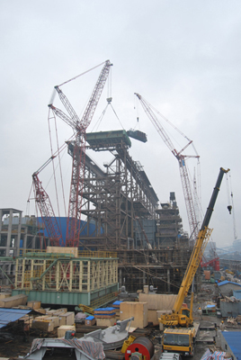 3月16日上午,由中國五冶集團(tuán)上海有限機電公司承建的寶鋼焦?fàn)t干熄焦項目提升機臺架吊裝完成。