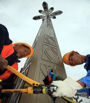 5月30日,中國(guó)五冶集團(tuán)路橋公司內(nèi)江漢安大道改建工程完成路面鋪油節(jié)點(diǎn)。圖為施工人員正在安裝路燈。???????? ?(鄧超攝)